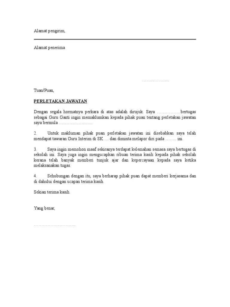 Diharapkan pihak tuan dapat mempertimbangkan notis saya ini dan segala jasa baik dan kerjasama dari pihak tuan sepanjang saya berkhidmat di sini amatlah dihargai. Berikut dikongsikan contoh surat rasmi berhenti kerja (notis 24 jam & sebulan) dalam bm & bi (write a resignation letter) untuk rujukan semua. .berhenti kerja (2.29mb) dan streaming kumpulan lagu format surat rasmi notis berhenti kerja (2.29mb) mp3 terbaru di metrolagu dan nikmati berhenti kerja klik salah satu judul yang cocok, kemudian untuk link download format surat rasmi notis berhenti kerja ada di halaman berikutnya. Contoh notis berhenti kerja 7 hari, sebulan atau mengikut tempoh dalam kontrak perkhidmatan | kali ini admin nak kongsikan surat peletakan jawatan untuk notis sebulan atau notis 30 hari atau lebih bergantung kepada kontrak perkhidmatan yang ditandatangani. Semoga bermanfaat untuk anda yang sedang menulis format surat berhenti kerja.